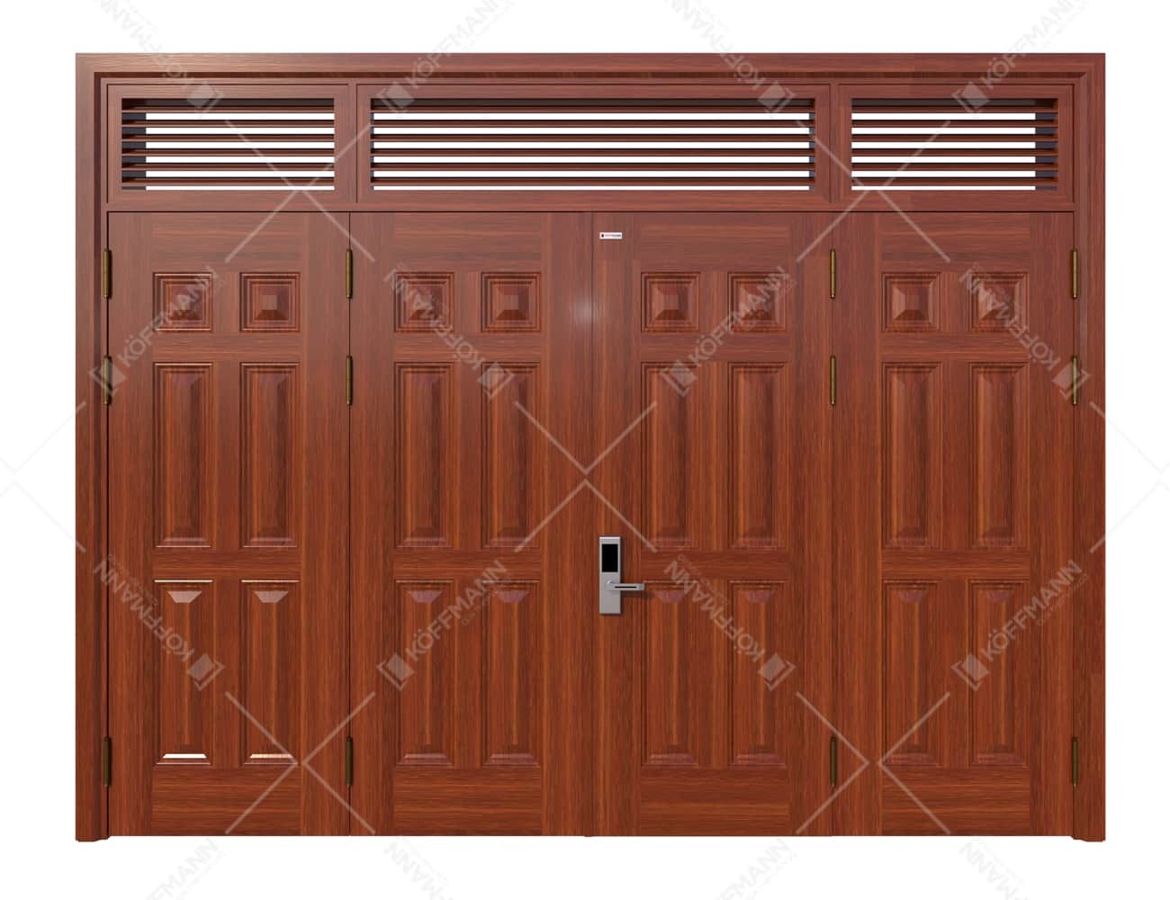 - Koffmann đã phát triển dòng sản phẩm cửa với sự kết hợp của các chất liệu thép mạ điện… mang kiểu dáng hiện đại và phong phú về màu sắc. Sản phẩm được thiết kế với ô thoáng nan chớp, giúp cho sản phẩm có được tính thẩm mỹ mà vẫn đảm bảo mang đến không gian thoáng đãng, hiện đại cho công trình.